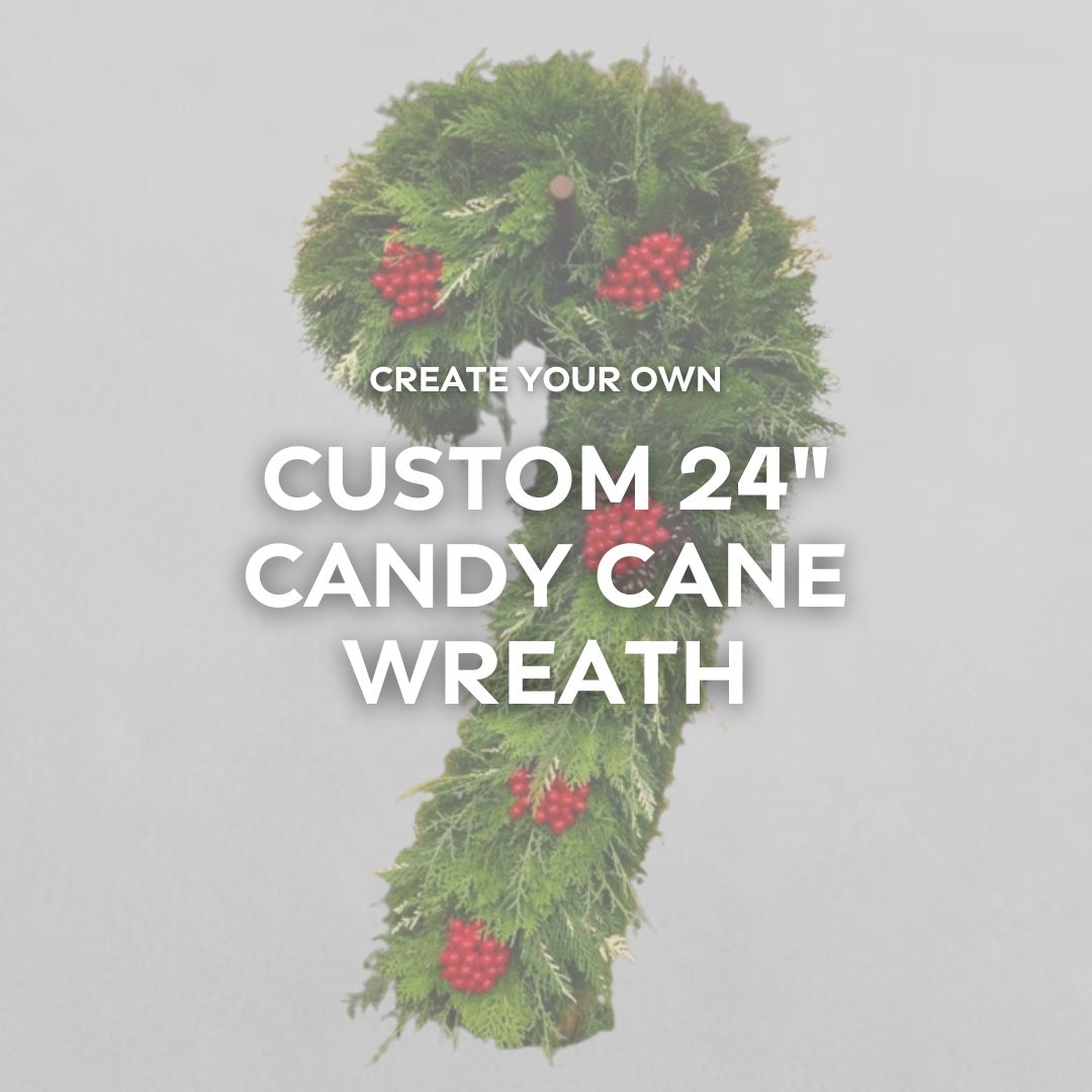 Create your own 24″ candy cane-shape wreath this season, with your choice of our Southern Christmas greenery! This option is fully customizable, with your choice of base greenery, up to (3) additional varieties mixed in and add-ons, handcrafted to order.