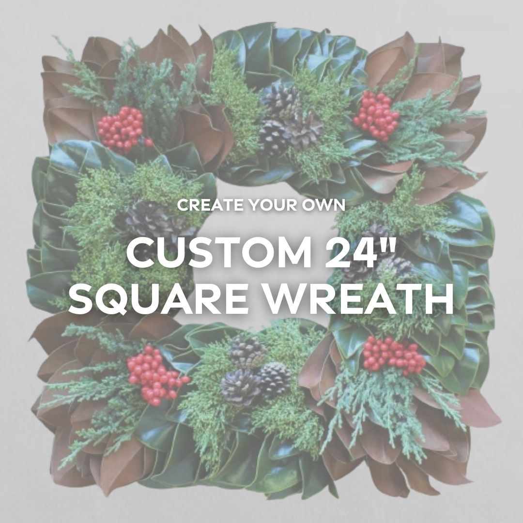 Create your own 24″ square wreath this season, with your choice of our Southern Christmas greenery! This option is fully customizable, with your choice of base, up to (3) additional varieties of greenery mixed in and add-ons, handcrafted to order.