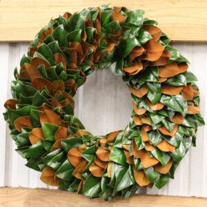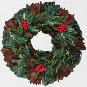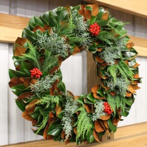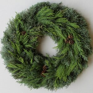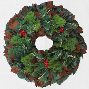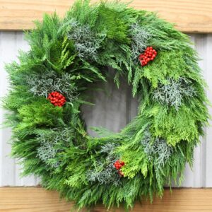 Options for greenery for wreaths include Arborvitae, Blueberry Cedar, Boxwood, Carolina Sapphire Cypress, Eucalyptus, Gold Tip Cedar, Green Leyland Cypress, Magnolia, Green Magnolia, Ming Pine, Short Pine and Variegated Leyland Cypress.